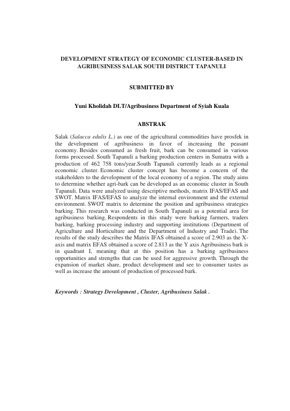 YUNI KHOLIDAH DLT, STRATEGI PENGEMBANGAN KLASTER EKONOMI BERBASIS AGRIBISNIS SALAK DI KABUPATEN TAPANULI SELATAN. Banda Aceh Universitas Syiah Kuala,2016
