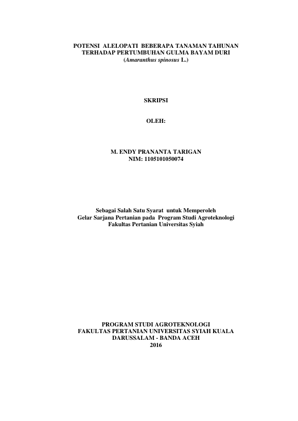 M. ENDY PRANANTA TARIGAN, POTENSI ALELOPATI BEBERAPA TANAMAN TAHUNAN TERHADAP PERTUMBUHAN GULMA BAYAM DURI (AMARANTHUS SPINOSUS L.). Banda Aceh Universitas Syiah Kuala,2016