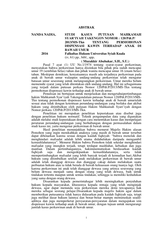 NANDA NADIA, STUDI KASUS PUTUSAN MAHKAMAH SYAR’IYAH TAKENGON NOMOR 120/PDT.P/2013/MS-TKN TENTANG PERMOHONAN DISPENSASI KAWIN TERHADAP ANAK DI BAWAH UMUR. Banda Aceh Universitas Syiah Kuala,2016