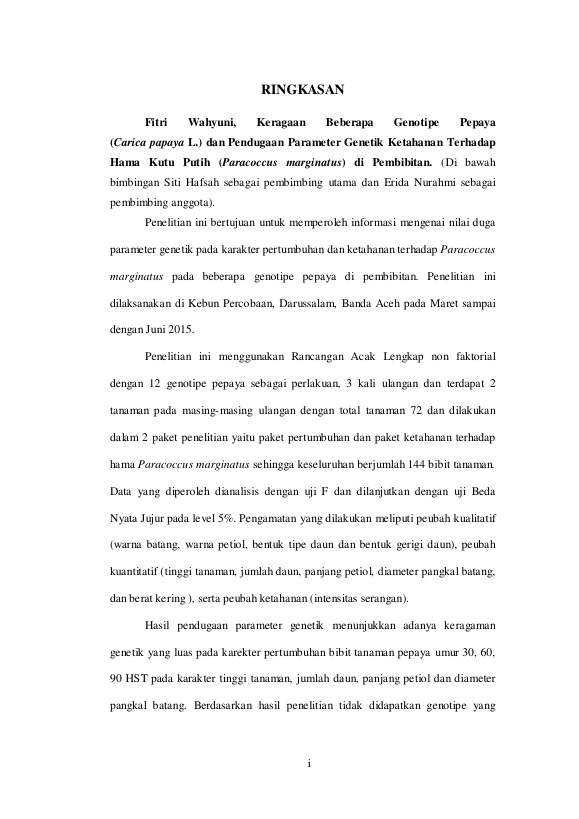 Baca Juga : KERAGAAN BEBERAPA GENOTIPE PEPAYA (CARICA PAPAYA L.) DAN PENDUGAAN PARAMETER GENETIK KETAHANAN TERHADAP HAMA KUTU PUTIH (PARACOCCUS MARGINATUS) DI PEMBIBITAN (Fitri Wahyuni, 2016)