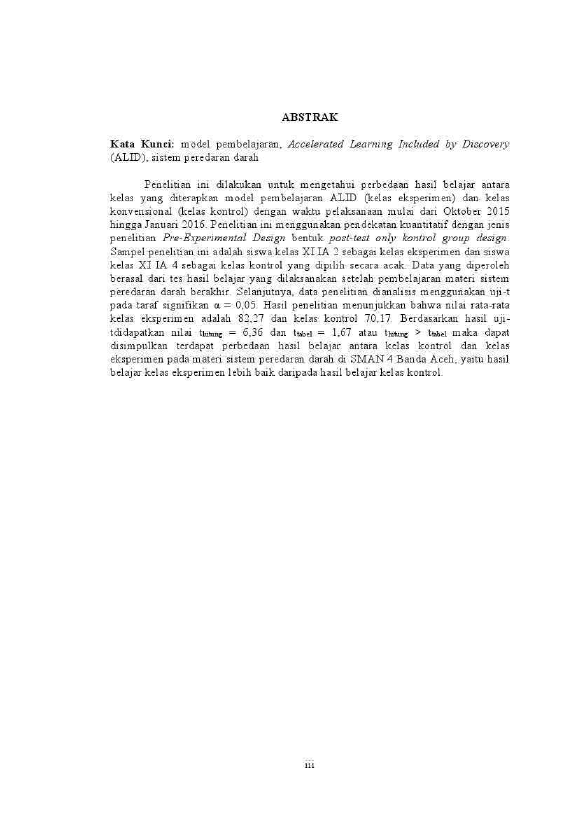 Maisarah, PERBEDAAN HASIL BELAJAR KOGNITIF SISWA KELAS MODEL PEMBELAJARAN ACCELERATED LEARNING INCLUDED BY DISCOVERY (ALID) DAN KELAS KONVENSIONAL PADA MATERI SISTEM PEREDARAN DARAH DI SMAN 4 BANDA ACEH. Banda Aceh Universitas Syiah Kuala,2016
