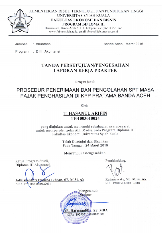 T. HASANUL ARIFIN, PROSEDUR PENERIMAAN DAN PENGOLAHAN SPT MASA PAJAK PENGHASILAN DI KPP PRATAMA BANDA ACEH. Banda Aceh Universitas Syiah Kuala,2016