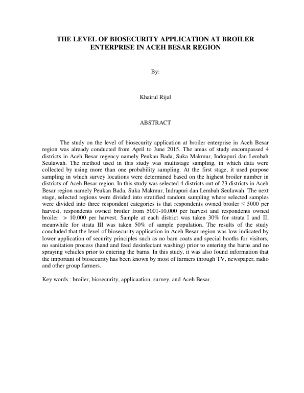 Baca Juga : TINGKAT APLIKASI SISTEM BIOSEKURITI PADA PETERNAKAN AYAM BROILER DI KABUPATEN ACEH BESAR (Khairul Rijal, 2016)