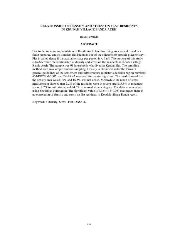 Bayu Permadi, HUBUNGAN KEPADATAN DENGAN STRES PADA WARGA RUMAH SUSUN SEDERHANA SEWA (RUSUSNAWA) DI GAMPONG KEUDAH BANDA ACEH. Banda Aceh Universitas Syiah Kuala,2016