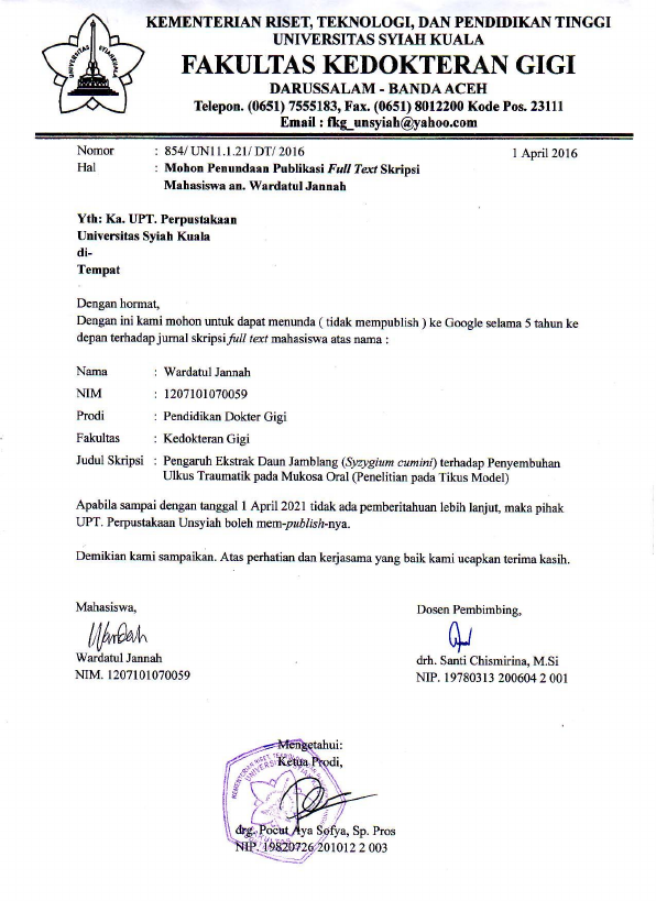 Baca Juga : PENGARUH EKSTRAK DAUN JAMBLANG (SYZYGIUM CUMINI) TERHADAP PENYEMBUHAN ULKUS TRAUMATIK PADA MUKOSA ORAL (PENELITIAN PADA TIKUS MODEL) (Wardatul Jannah , 2016)