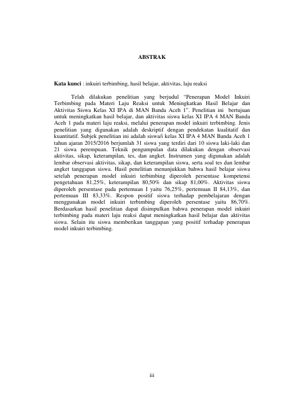 WAHYUNI, PENERAPAN MODEL INKUIRI TERBIMBING PADA MATERI LAJU REAKSI UNTUK MENINGKATKAN HASIL BELAJAR DAN AKTIVITAS SISWA KELAS XI IPA DI MAN BANDA ACEH 1. Banda Aceh Universitas Syiah Kuala,2016