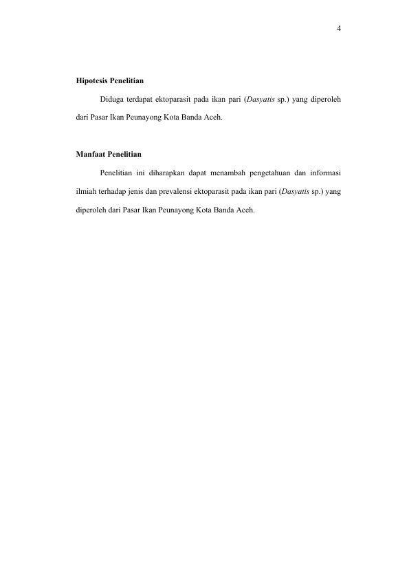 Arini Ulfa Khaira, IDENTIFIKASI EKTOPARASIT PADA IKAN PARI (DASYATIS SP.) DI PASAR IKAN PEUNAYONG KOTA BANDA ACEH. Banda Aceh Fakultas Kedokteran Hewan,2016
