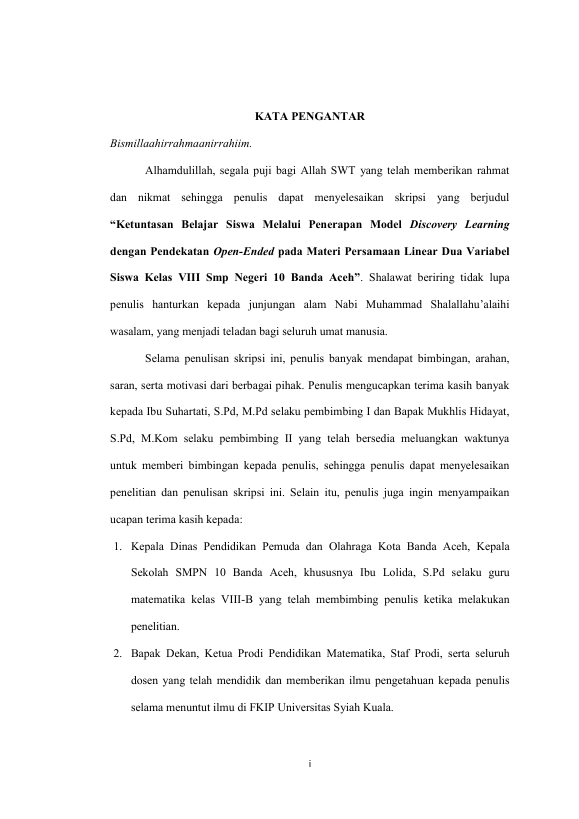 ERYZA ILMIANA, KETUNTASAN BELAJAR SISWA MELALUI PENERAPAN MODEL DISCOVERY LEARNING DENGAN PENDEKATAN OPEN-ENDED PADA MATERI PERSAMAAN LINEAR DUA VARIABEL SISWA KELAS VIII SMP NEGERI 10 BANDA ACEH. Banda Aceh Fakultas Keguruan dan Ilmu Pendidikan,2016