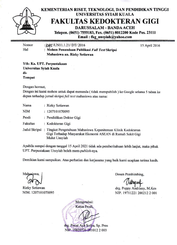Rizky Setiawan , TINGKAT PENGETAHUAN MAHASISWA KEPANITERAAN KLINIK KEDOKTERAN GIGI TERHADAP MASYARAKAT EKONOMI ASEAN DI RUMAH SAKIT GIGI MULUT UNSYIAH. Banda Aceh Universitas Syiah Kuala,2016