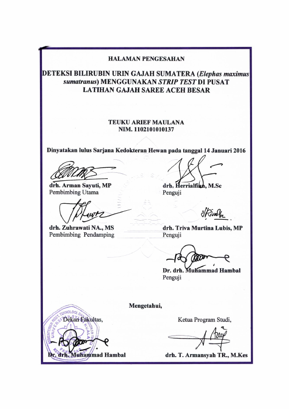 Teuku Arief Maulana, DETEKSI BILIRUBIN URIN GAJAH SUMATERA (ELEPHAS MAXIMUS SUMATRANUS) MENGGUNAKAN STRIP TEST DI PUSAT LATIHAN GAJAH SAREE ACEH BESAR. Banda Aceh Universitas Syiah Kuala,2016