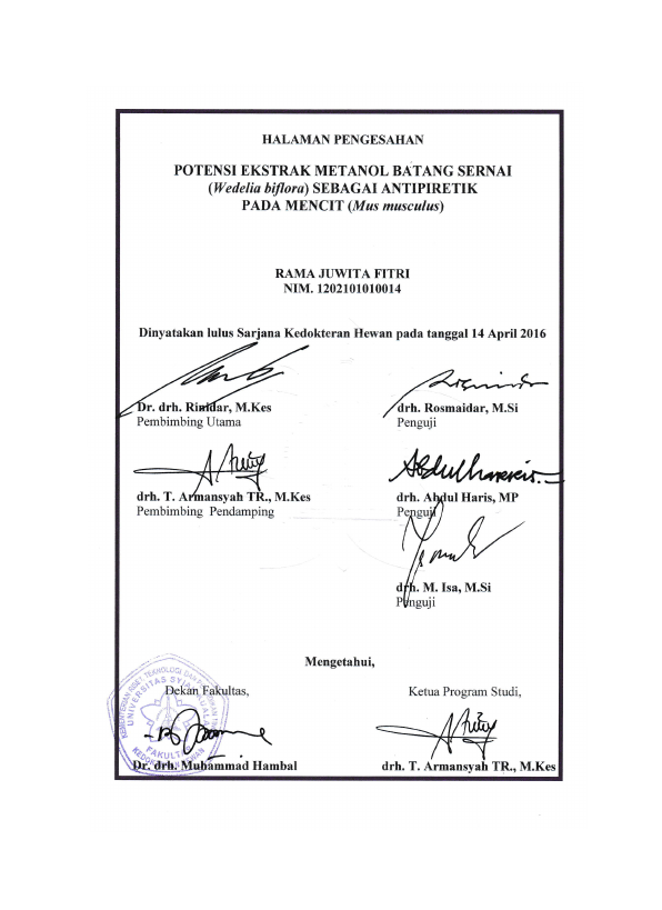 Rama Juwita Fitri, POTENSI EKSTRAK METANOL BATANG SERNAI (WEDELIA BIFLORA) SEBAGAI ANTIPIRETIK PADA MENCIT (MUS MUSCULUS). Banda Aceh Universitas Syiah Kuala,2016