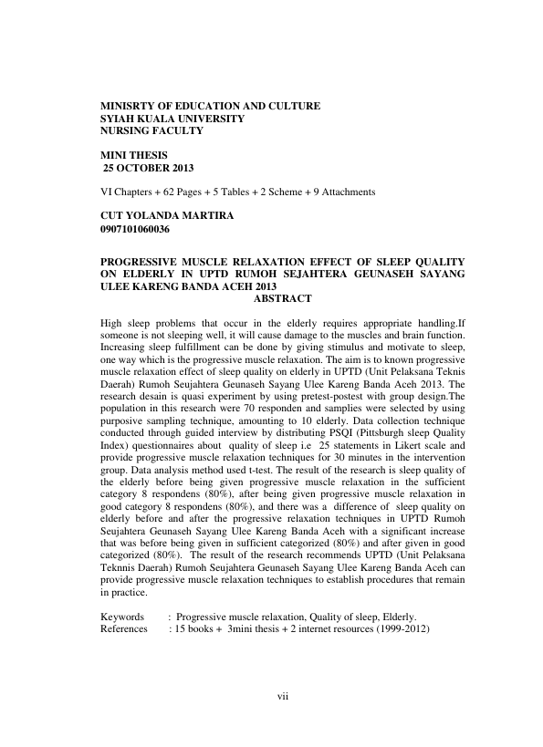 cut yolanda martira, PENGARUH RELAKSASI OTOT PROGRESIF TERHADAP KUALITAS TIDUR LANSIA DI UPTD SEJAHTERA GEUNASEH SAYANG ULEE KARENG BANDA ACEH TAHUN 2013. Banda Aceh Fakultas Keperawatan,2013