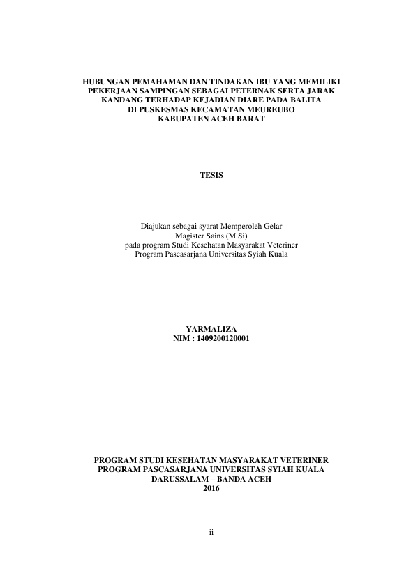 YARMALIZA, HUBUNGAN PEMAHAMAN DAN TINDAKAN IBU YANG MEMILIKI PEKERJAAN SAMPINGAN SEBAGAI PETERNAK SERTA JARAK KANDANG TERHADAP KEJADIAN DIARE PADA BALITA DI PUSKESMAS KECAMATAN MEUREUBO KABUPATEN ACEH BARAT. Banda Aceh Universitas Syiah Kuala,2016