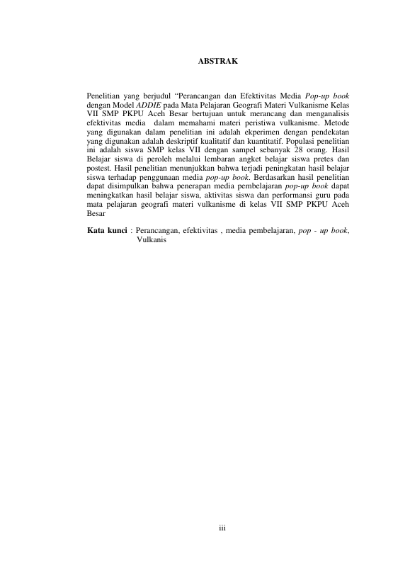 Baca Juga : PERANCANGAN DAN EFEKTIVITAS MEDIA BELAJAR POP-UP BOOK DENGAN MODEL ADDIE PADA MATA PELAJARAN GEOGRAFI MATERI VULKANISME KELAS VII SMP PKPU ACEH BESAR (Marhamah, 2016)