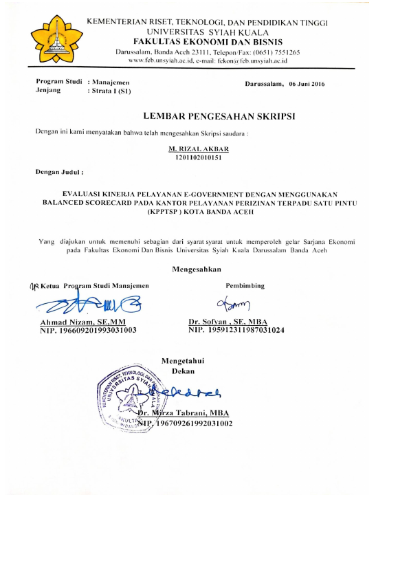 M. RIZAL AKBAR, EVALUASI KINERJA PELAYANAN E-GOVERNMENT DENGAN MENGGUNAKAN BALANCED SCORECARD PADA KANTOR PELAYANAN PERIZINAN TERPADU SATU PINTU (KPPTSP) KOTA BANDA ACEH. Banda Aceh Universitas Syiah Kuala,2016