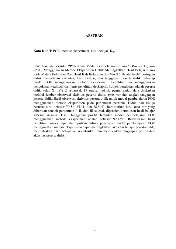 Baca Juga : PENERAPAN MODEL PEMBELAJARAN PREDICT OBSERVE EXPLAIN (POE) MENGGUNAKAN METODE EKSPERIMEN UNTUK MENINGKATKAN HASIL BELAJAR SISWA PADA MATERI KELARUTAN DAN HASIL KALI KELARUTAN DI SMAN 5 BANDA ACEH (Putri Khairuzan, 2016)