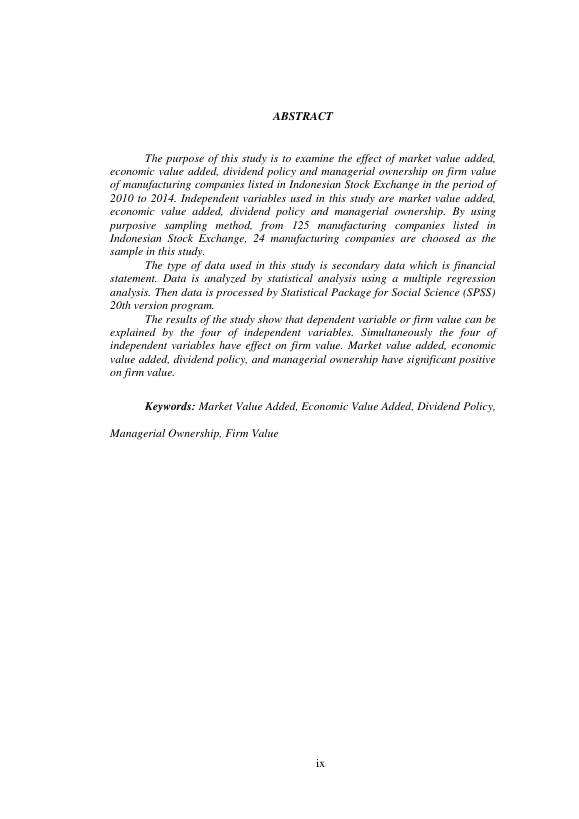 Cut Sarah Syahirah, PENGARUH MARKET VALUE ADDED, ECONOMIC VALUE ADDED, KEBIJAKAN DIVIDEN, DAN KEPEMILIKAN MANAJERIAL TERHADAP NILAI PERUSAHAAN PADA PERUSAHAAN MANUFAKTUR YANG TERDAFTAR DI BURSA EFEK INDONESIA TAHUN 2010-2014. Banda Aceh Universitas Syiah Kuala,2016