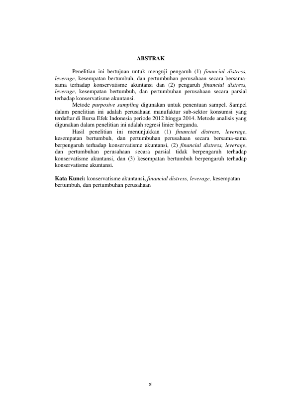 Baca Juga : PENGARUH FINANCIAL DISTRESS, LEVERAGE, KESEMPATAN BERTUMBUH, DAN PERTUMBUHAN PERUSAHAAN TERHADAP KONSERVATISME AKUNTANSI PADA PERUSAHAAN MANUFAKTUR YANG TERDAFTAR DI BURSA EFEK INDONESIA TAHUN 2012-2014 (AMALUL AUNI, 2016)