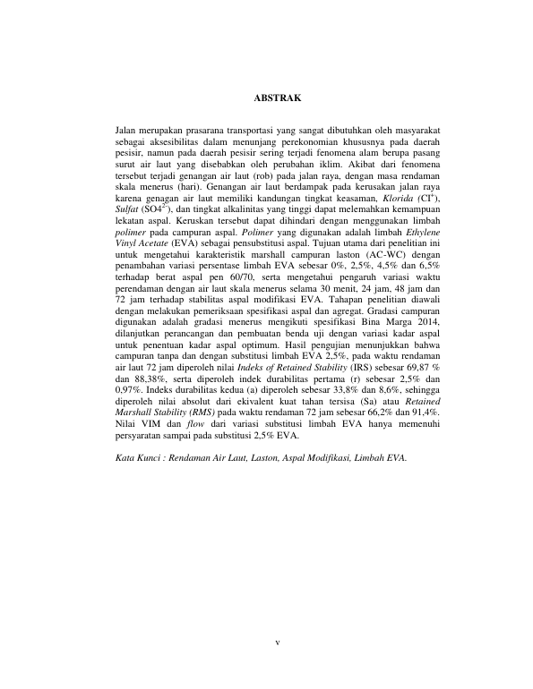 Baca Juga : PENGARUH LAMA PERENDAMAN DENGAN AIR LAUT TERHADAP DURABILITAS CAMPURAN LASTON (AC-WC) MENGGUNAKAN SUBSTITUSI LIMBAH ETHYLENE VINYL ACETATE (EVA) (Lathifah Maulida Nazaruddin, 2016)
