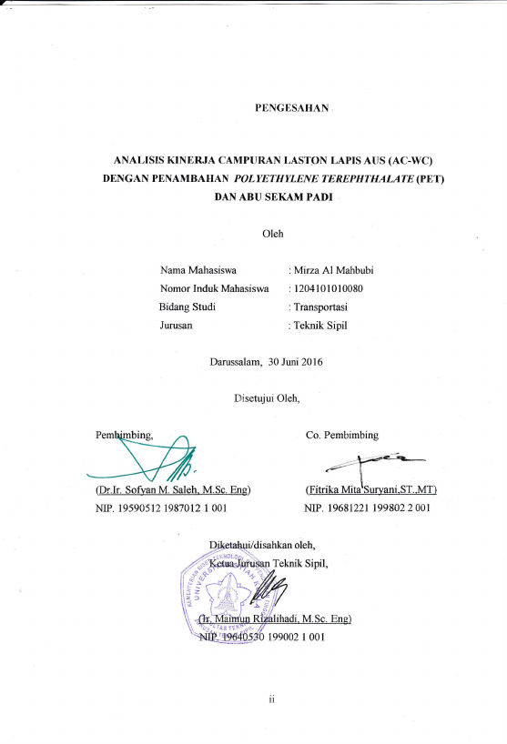 MIRZA AL MAHBUBI, ANALISIS KINERJA CAMPURAN LASTON LAPIS AUS (AC-WC) DENGAN PENAMBAHAN POLYETHYLENE TEREPHTHALATE (PET) DAN ABU SEKAM PADI. Banda Aceh Universitas Syiah Kuala,2016