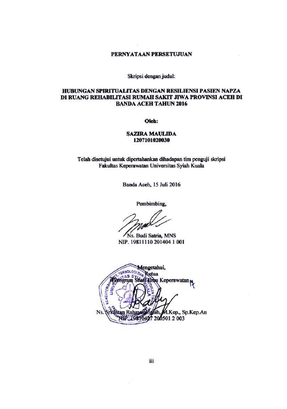 SAZIRA MAULIDA, HUBUNGAN SPIRITUALITAS DENGAN RESILIENSI PASIEN NAPZA DI RUANG REHABILITASI RUMAH SAKIT JIWA PROVINSI ACEH DI BANDA ACEH TAHUN 2016. Banda Aceh Universitas Syiah Kuala,2016