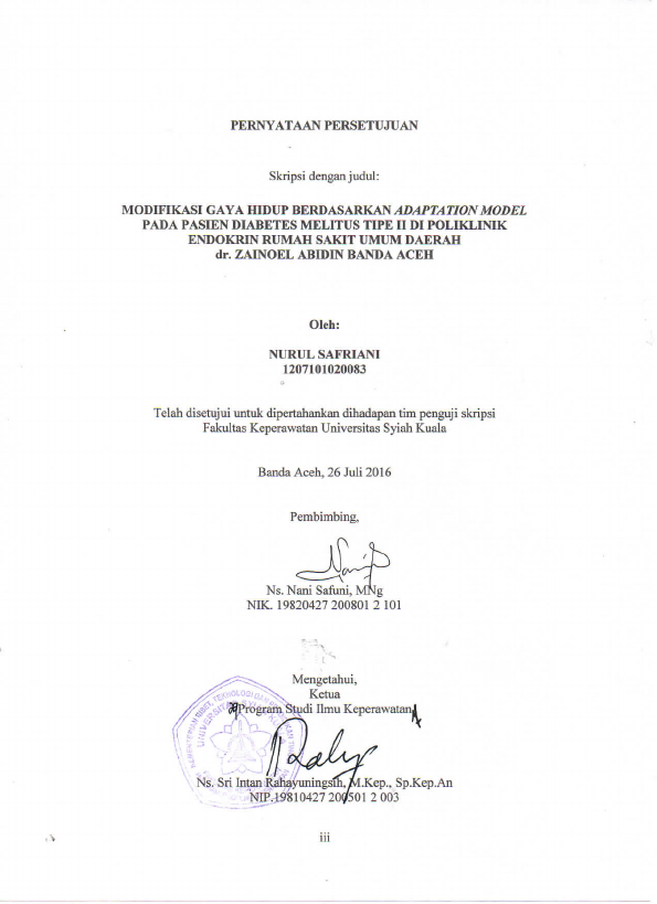 NURUL SAFRIANI, MODIFIKASI GAYA HIDUP BERDASARKAN ADAPTATION MODEL PADA PASIEN DIABETES MELITUS TIPE II DI POLIKLINIK ENDOKRIN RUMAH SAKIT UMUM DAERAH DR. ZAINOEL ABIDIN BANDA ACEH. Banda Aceh Universitas Syiah Kuala,2016