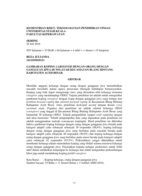 REZA JULIANDA, GAMBARAN KOPING CAREGIVER DENGAN ORANG DENGAN GANGGUAN JIWA DI WILAYAH KECAMATAN BLANG BINTANG KABUPATEN ACEH BESAR. Banda Aceh Universitas Syiah Kuala,2016