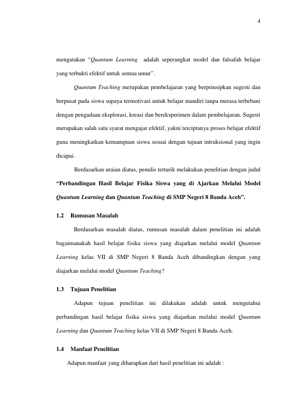 Sarah Nadia, PERBANDINGAN HASIL BELAJAR FISIKA SISWA YANG DIAJARKAN MELALUI MODEL PEMBELAJARAN QUANTUM LEARNING DAN QUANTUM TEACHING DI SMPN 8 BANDA ACEH. Banda Aceh Universitas Syiah Kuala,2016