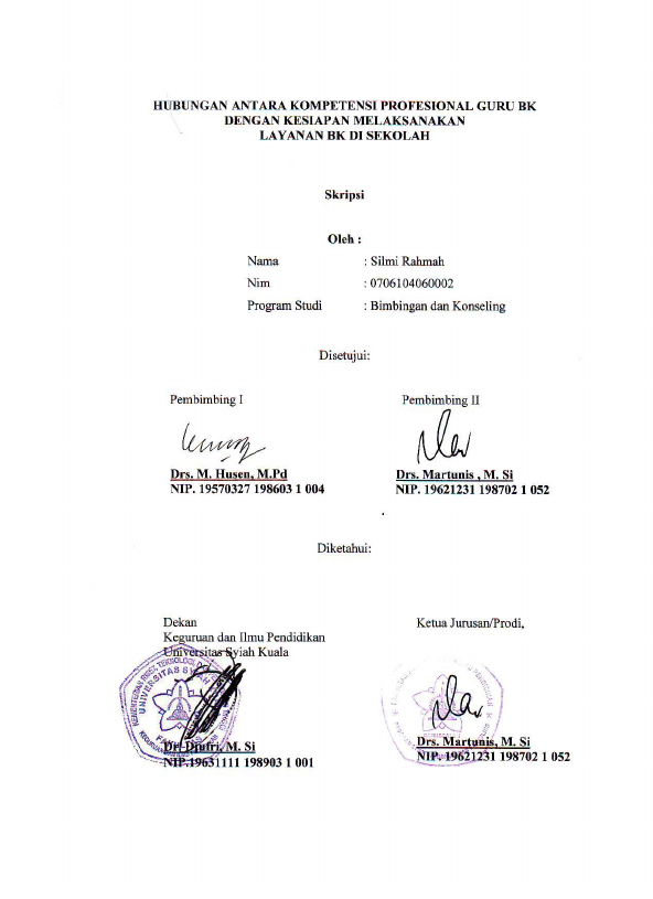Silmi Rahmah, HUBUNGAN ANTARA KOMPETENSI PROFESIONAL GURU BK DENGAN KESIAPAN MELAKSANAKAN LAYANAN BK DI SEKOLAH (STUDI PENELITIAN PADA SMA SE-KOTA BANDA ACEH). Banda Aceh Universitas Syiah Kuala,2016