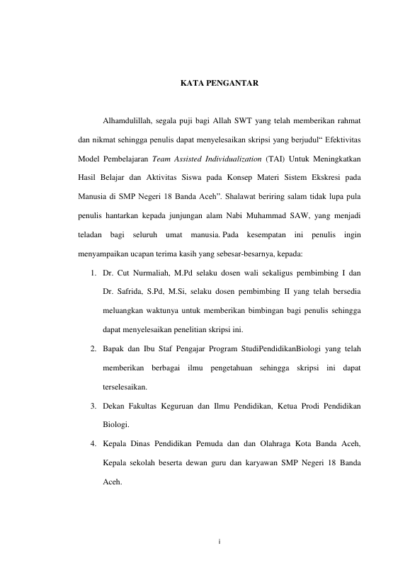 Meli Andani, EFEKTIVITAS MODEL PEMBELAJARAN TEAM ASSISTED INDIVIDUALIZATION (TAI) UNTUK MENINGKATKAN HASIL BELAJAR DAN AKTIVITAS SISWA PADA KONSEP SISTEM EKSKRESI PADA MANUSIA KELAS VIII DI SMP NEGERI 18 BANDA ACEH. Banda Aceh Universitas Syiah Kuala,2016
