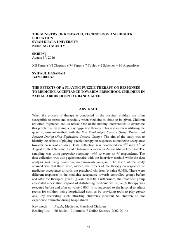 SYIFAUL HASANAH, PENGARUH TERAPI BERMAIN PUZZLE TERHADAP RESPON PENERIMAAN OBAT PADA ANAK USIA PRASEKOLAH DI RUMAH SAKIT UMUM DAERAH DR. ZAINOEL ABIDIN BANDA ACEH. Banda Aceh Universitas Syiah Kuala,2016