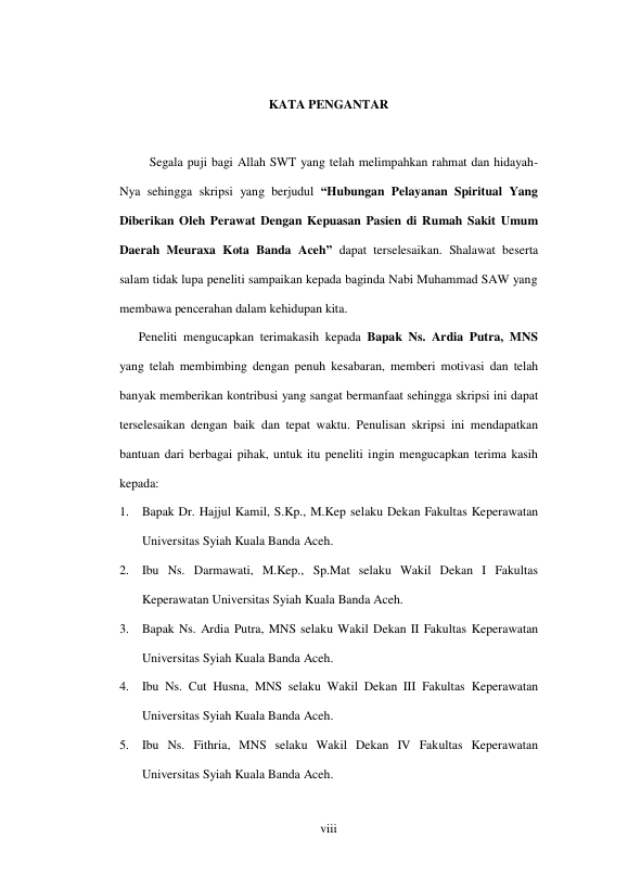 YESIKA NURDINA, HUBUNGAN PELAYANAN SPIRITUAL YANG DIBERIKAN OLEH PERAWAT DENGAN KEPUASAN PASIEN DI RUMAH SAKIT UMUM DAERAH MEURAXA KOTA BANDA ACEH. Banda Aceh Universitas Syiah Kuala,2016