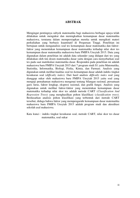 Baca Juga : SIMULASI AKURASI MENGGUNAKAN METODE RANDOM FOREST (STUDI KASUS : TES KEMAMPUAN DASAR MATEMATIKA MAHASISWA BARU FMIPA UNSYIAH 2015) (PUTRI SHALIHATUL ULA, 2017)