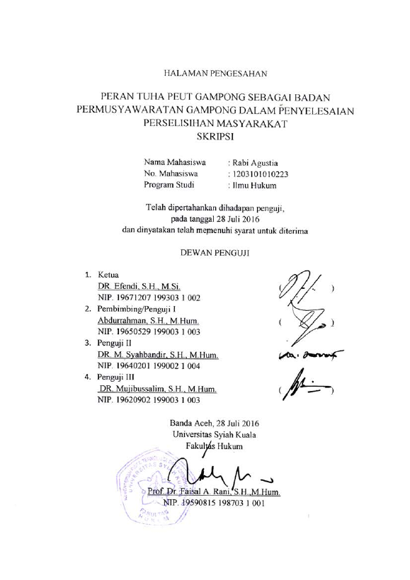 RABI AGUSTIA, PERAN TUHA PEUT GAMPONG SEBAGAI BADAN PERMUSYAWARATAN GAMPONG DALAM PENYELESAIAN PERSELISIHAN MASYARAKAT (SUATU PENELITIAN DI KECAMATAN BABAHROT KABUPATEN ACEH BARAT DAYA). Banda Aceh Universitas Syiah Kuala,2016