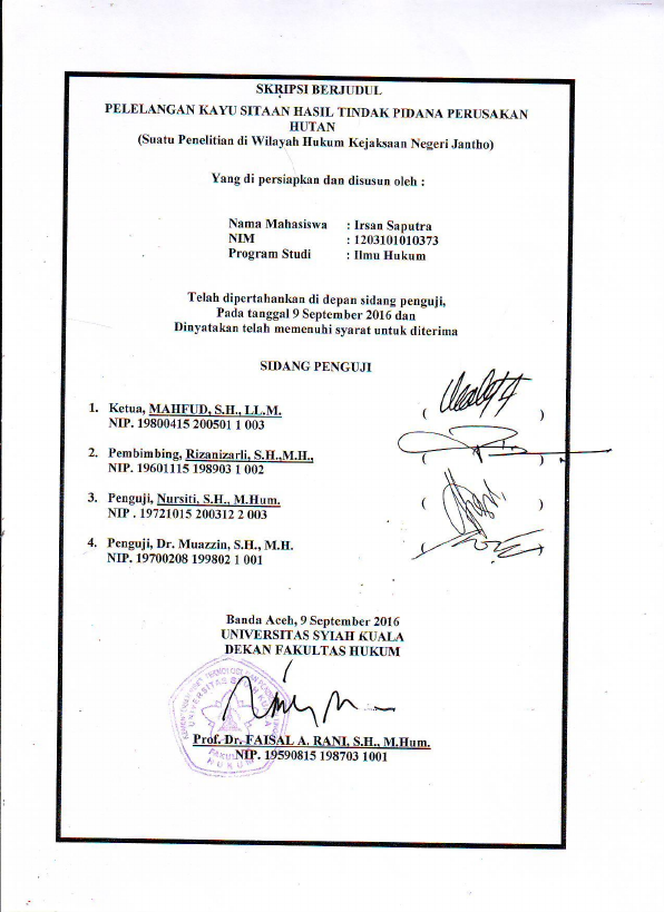 Irsan Saputra, PELELANGAN KAYU SITAAN HASIL TINDAK PIDANA PERUSAKAN HUTAN (SUATU PENELITIAN DI WILAYAH HUKUM KEJAKSAAN NEGERI JANTHO). Banda Aceh Universitas Syiah Kuala,2016