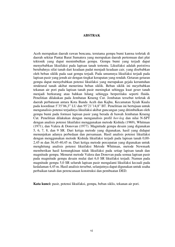 Akmal Zulfi, ANALISIS POTENSI LIKUIFAKSI LAPISAN PASIR PADA LOKASI JEMBATAN KRUENG CUT (MENGGUNAKAN METODE KISHIDA, WHITMAN DAN VALERA & DONOVAN). Banda Aceh Universitas Syiah Kuala,2016