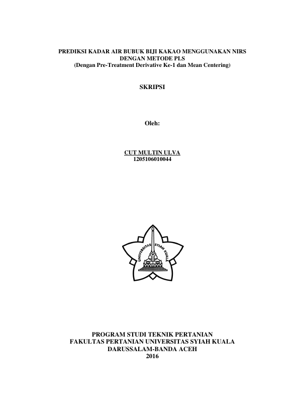 Cut Multin Ulva, PREDIKSI KADAR AIR BUBUK BIJI KAKAO MENGGUNAKAN NIRS DENGAN METODE PLS (DENGAN PRE-TREATMENT DERIVATIVE KE-1 DAN MEAN CENTERING). Banda Aceh Universitas Syiah Kuala,2016