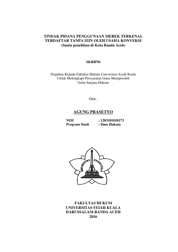 Agung Prasetyo, TINDAK PIDANA PENGGUNAAN MEREK TERKENAL TERDAFTAR TANPA IZIN OLEH USAHA KONVEKSI (SUATU PENELITIAN DI KOTA BANDA ACEH). Banda Aceh Universitas Syiah Kuala,2016