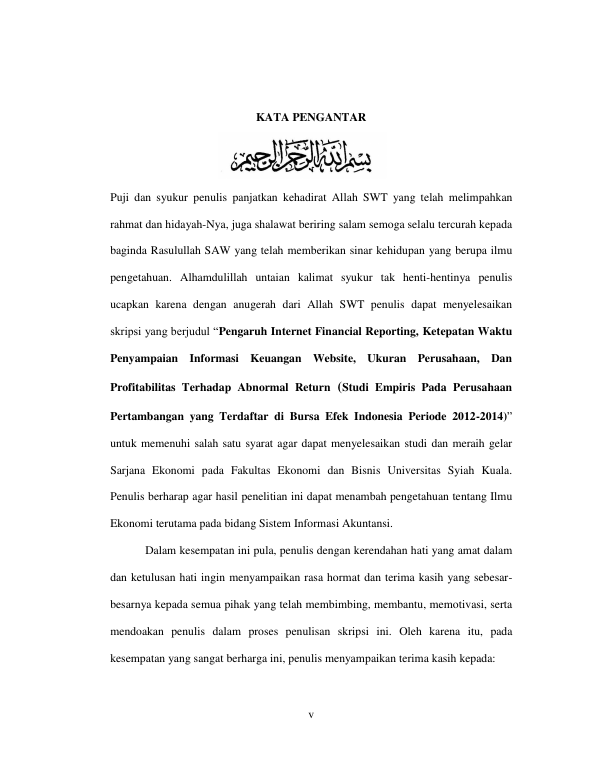 PENGARUH INTERNET FINANCIAL REPORTING, KETEPATAN WAKTU PENYAMPAIAN INFORMASI KEUANGAN WEBSITE, UKURAN PERUSAHAAN, DAN PROFITABILITAS TERHADAP ABNORMAL RETURN (STUDI EMPIRIS PADA PERUSAHAAN PERTAMBANGAN YANG TERDAFTAR DI BURSA EFEK INDONESIA PERIODE 2012-2014). Banda Aceh Universitas Syiah Kuala,2016