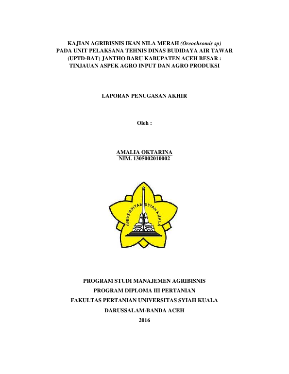 AMALIA OKTARINA, KAJIAN AGRIBISNIS IKAN NILA MERAH (OREOCHROMIS SP) PADAUNIT PELAKSANA TEHNIS DINAS BUDIDAYA AIR TAWAR (UPTD-BAT) JANTHO BARU KABUPATEN ACEH BESAR : TINJAUAN ASPEK AGRO INPUT DAN AGRO PRODUKSI. Banda Aceh Universitas Syiah Kuala,2016