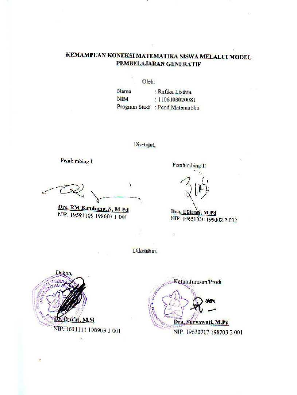 Rafika Listhia, KEMAMPUAN KONEKSI MATEMATIKA SISWA MELALUI MODEL PEMBELAJARAN GENERATIF. Banda Aceh Universitas Syiah Kuala,2016