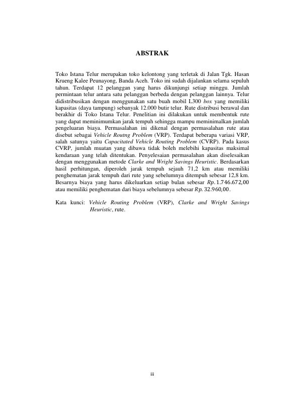 Wardatulaini, PENENTUAN RUTE DISTRIBUSI MENGGUNAKAN METODE CLARKE AND ERIGHT SAVINGS HEURISTIC (STUDI KASUS DISTRIBUSI TELUR TOKO ISTANA TELUR BANDA ACEH). Banda Aceh Universitas Syiah Kuala,2016