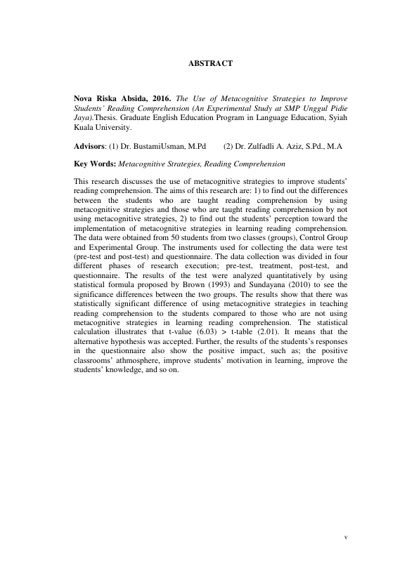 Baca Juga : A STUDY OF STUDENTS’ METACOGNITIVE AWARENESS IN READING COMPREHENSIONIN ENGLISH EDUCATION PROGRAM SYIAH KUALA UNIVERSITY (A QUANTITATIVE STUDY AT A READING CLASS) (Tika Suharni, 2017)