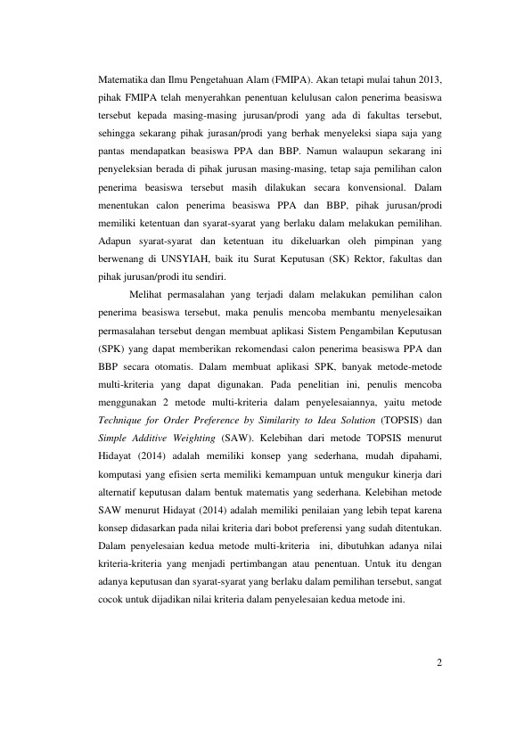 Angga Syahputra, PERBANDINGAN METODE TECHNIQUE FOR ORDER PREFERENCE BY SIMILARITY TO IDEA SOLUTION (TOPSIS) DAN SIMPLE ADDITIVE WEIGHTING (SAW) DALAM PENGAMBILAN KEPUTUSAN PENERIMA BEASISWA. Banda Aceh Universitas Syiah Kuala,2016