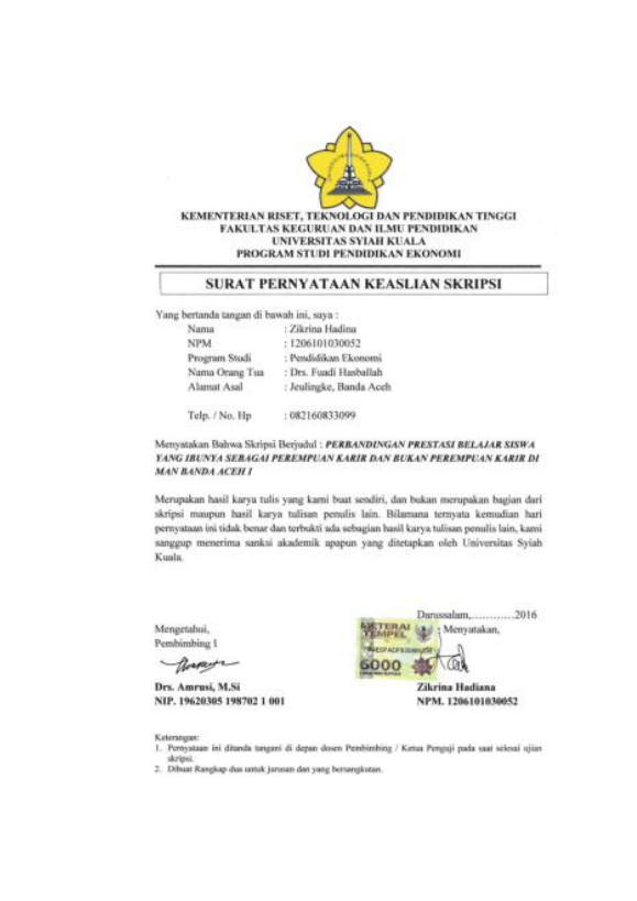 Zikrina Hadiana, PERBANDINGAN PRESTASI BELAJAR SISWA YANG IBUNYA SEBAGAI PEREMPUAN KARIR DAN BUKAN PEREMPUAN KARIR DI MAN BANDA ACEH I. Banda Aceh Universitas Syiah Kuala,2016