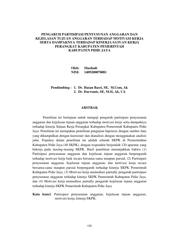 Musliadi, PENGARUH PARTISIPASI PENYUSUNAN ANGGARAN DAN KEJELASAN TUJUAN ANGGARAN TERHADAP MOTIVASI KERJA SERTA DAMPAKNYA TERHADAP KINERJA SATUAN KERJA PERANGKAT KABUPATEN PEMERINTAH KABUPATEN PIDIE JAYA. Banda Aceh Universitas Syiah Kuala,2016