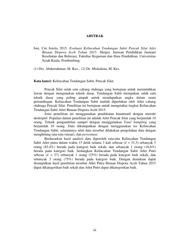 Cut Juwita Isni, EVALUASI KELINCAHAN TENDANGAN SABIT PENCAK SILAT ATLET BINAAN DISPORA ACEH TAHUN 2015. Banda Aceh Universitas Syiah Kuala,2016