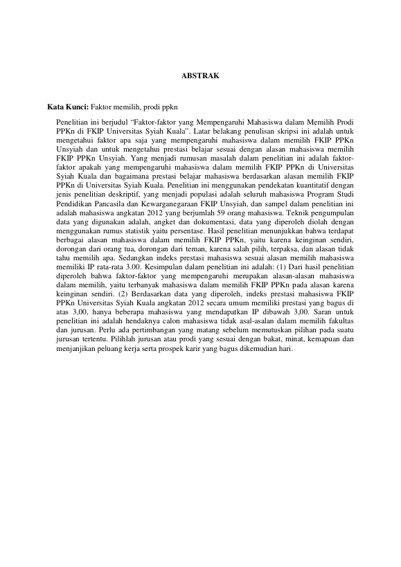 NURLIZA ULFAH, FAKTOR-FAKTOR YANG MEMPENGARUHI MAHASISWA DALAM MEMILIH PRODI PPKn DI FKIP UNIVERSITAS SYIAH KUALA. Banda Aceh Fakultas Keguruan dan Ilmu Pendidikan,2013