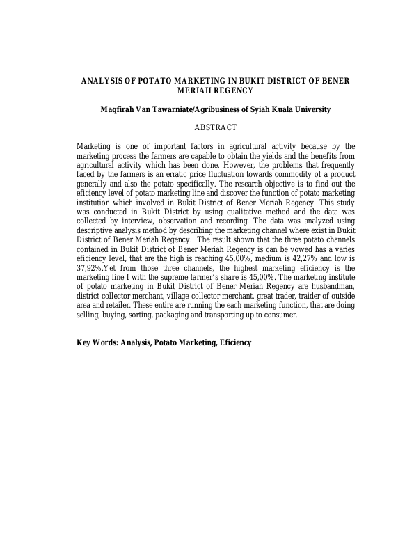 Maqfirah Van Tawar Niate, ANALISIS PEMASARAN KENTANG DI KECAMATAN BUKIT KABUPATEN BENER MERIAH. Banda Aceh Universitas Syiah Kuala,2016