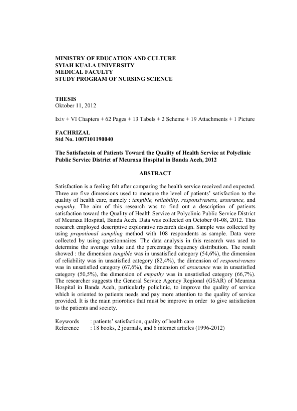 Fachrizal, Kepuasan Pasien Terhadap Kualitas Pelayanan Kesehatan Di Poliklinik Badan Layanan Umum Daerah Rumah Sakit Meuraxa Banda Aceh Tahun 2012. Banda Aceh Fakultas Kedokteran,2012